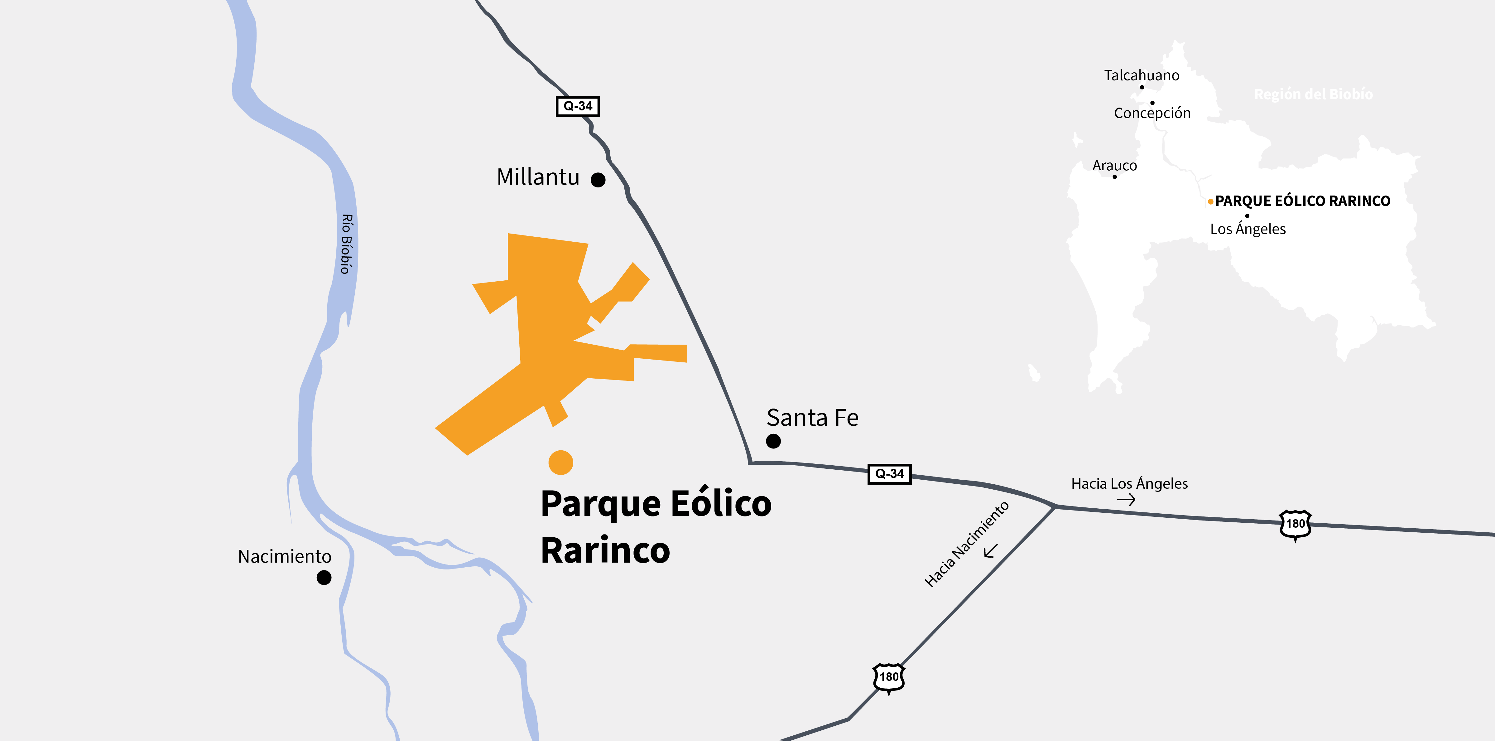 El Parque Eólico Rarinco se encuentra en la comuna de Los Ángeles, región del Bío Bío, en el sur de Chile.